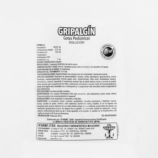 Paracetamol 100mg-clorfeniramina maleato 0.75mg-fenilefrina clorhidrato 1.5mg.