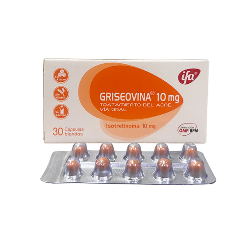Griseovina 10 mg. Isotretitoína 10 mg. Acción terapéutica: tratamiento del acné. No contiene azúcar. Sin gluten. Sin lácteos.